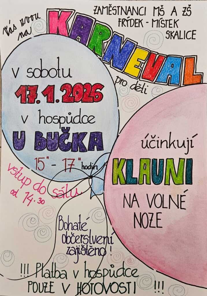 Ve dnech 27. 10. 2025, 22. 12. 2025, 23. 12. 2025 a 2. 1. 2026 bude z organizačních důvodů přerušen provoz mateřské školy.